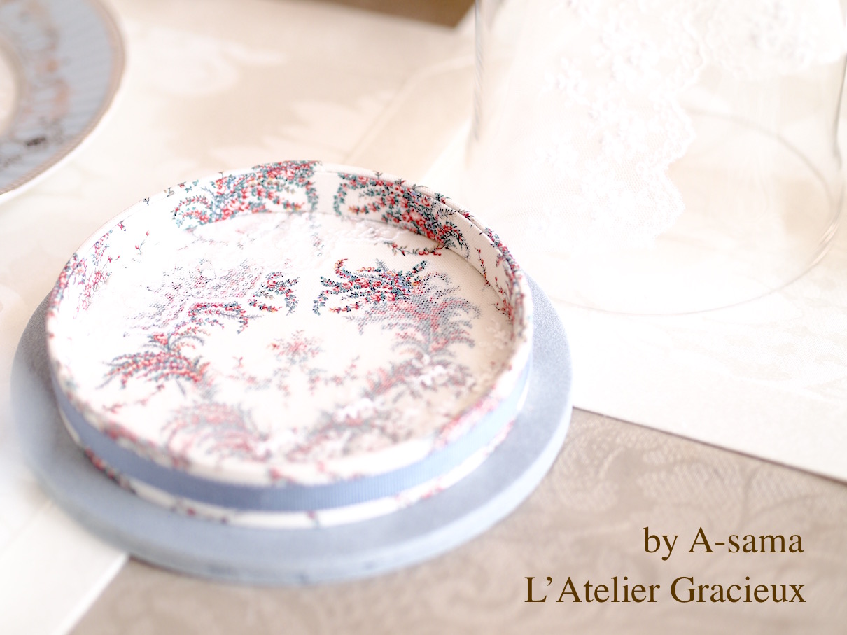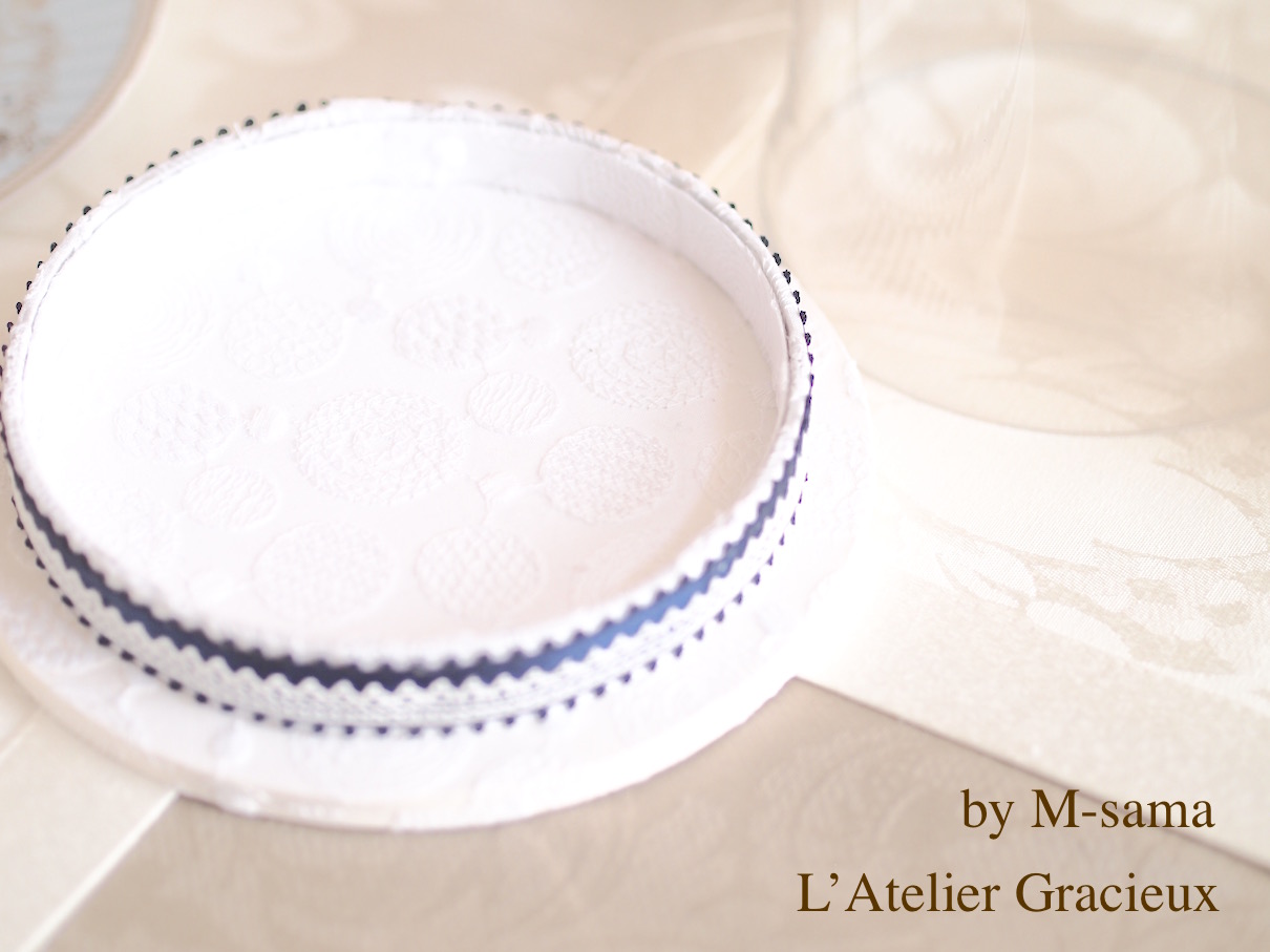 トレイ部分とベースを、サークル刺繍が施されたクリアホワイトの生地で、