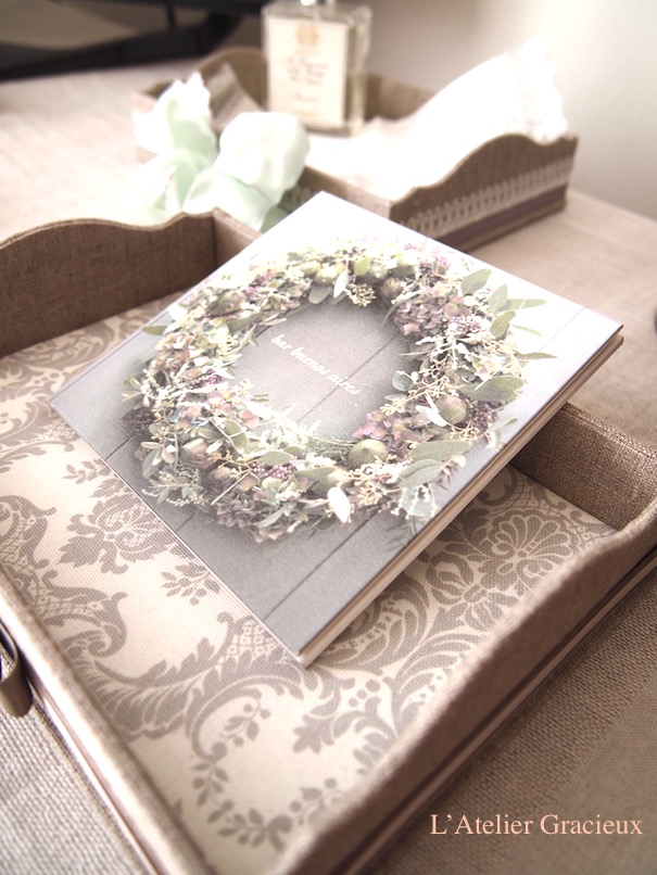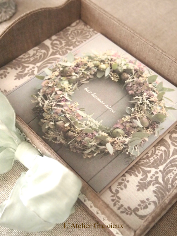 Mさんは、この布地にペールブルーとマットゴールドのリボンで装飾され、