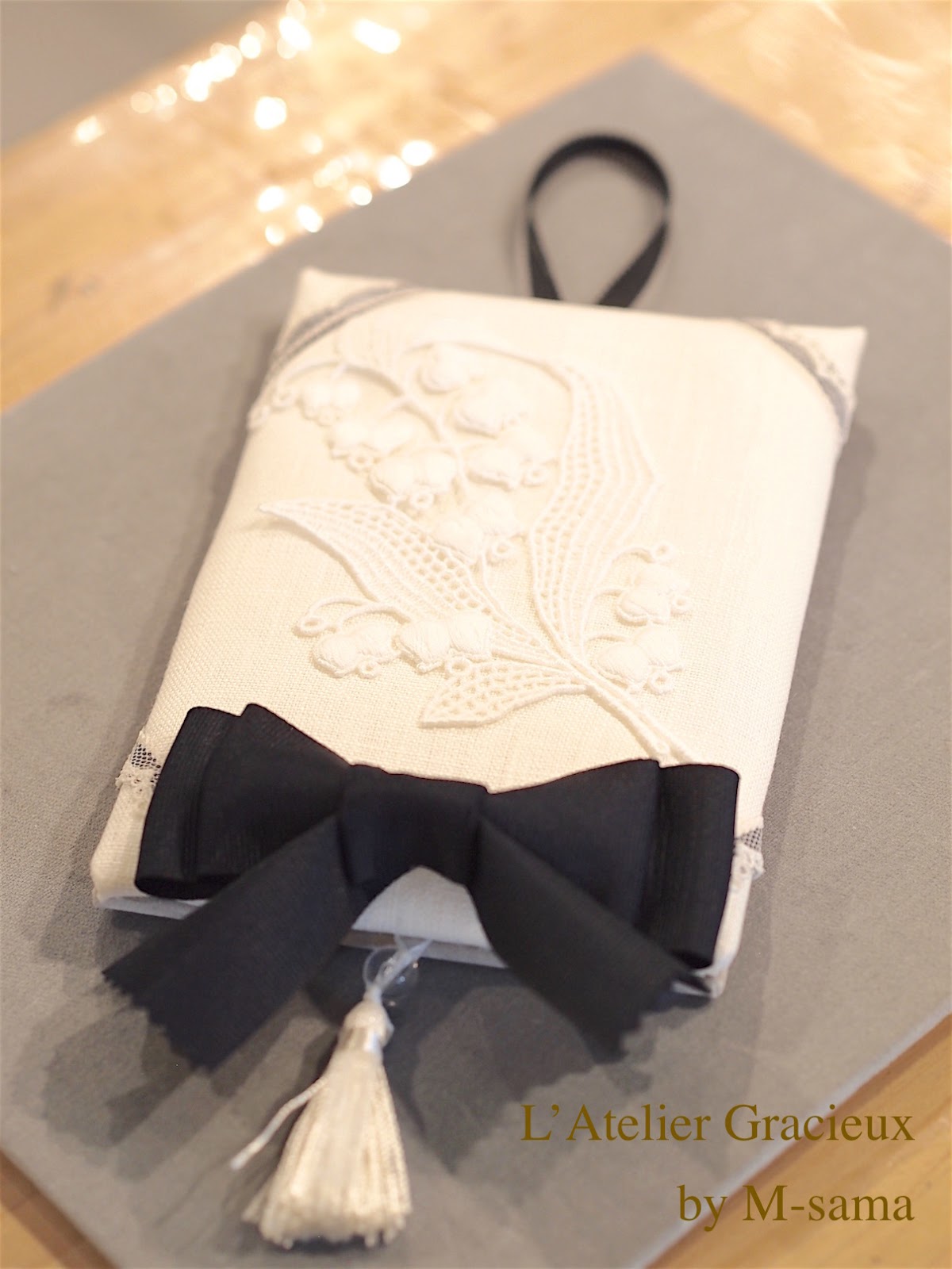 カードホルダーとなる部分は、グレーのサテンリボンに、