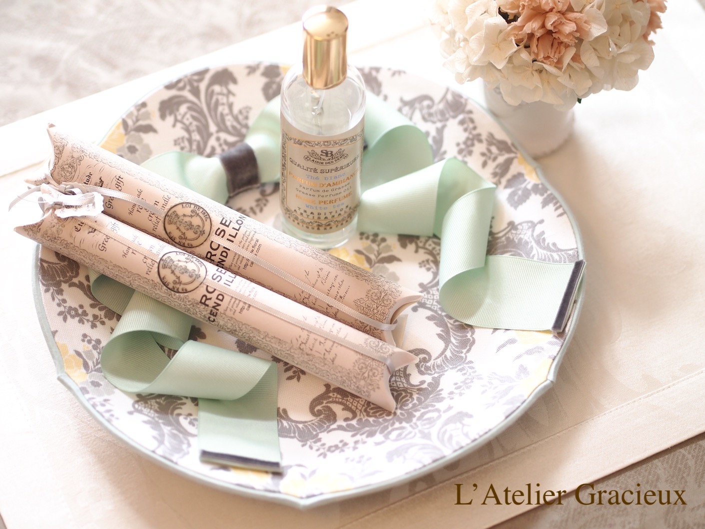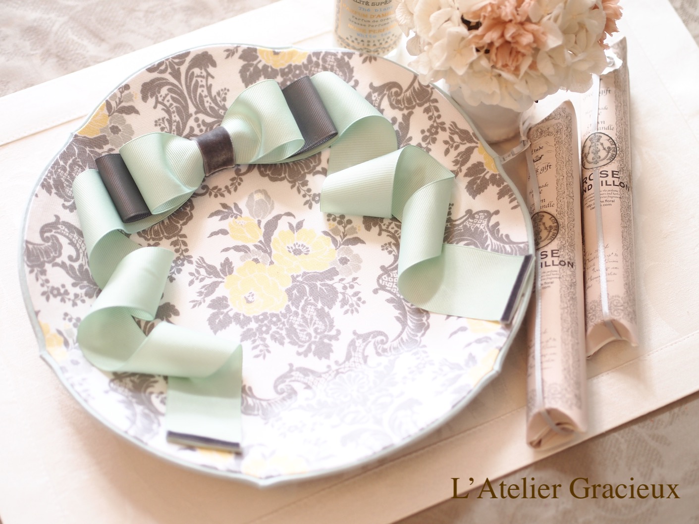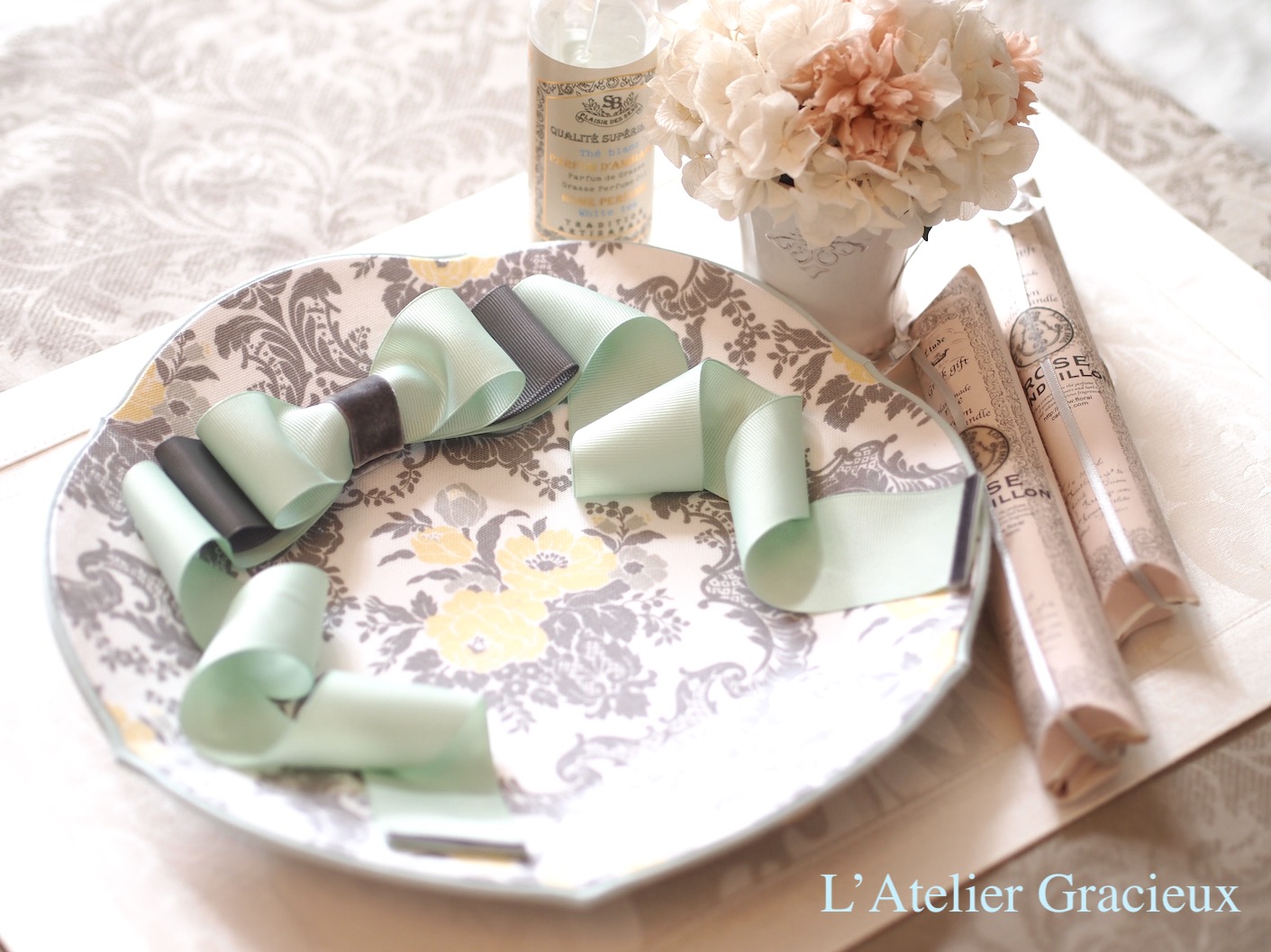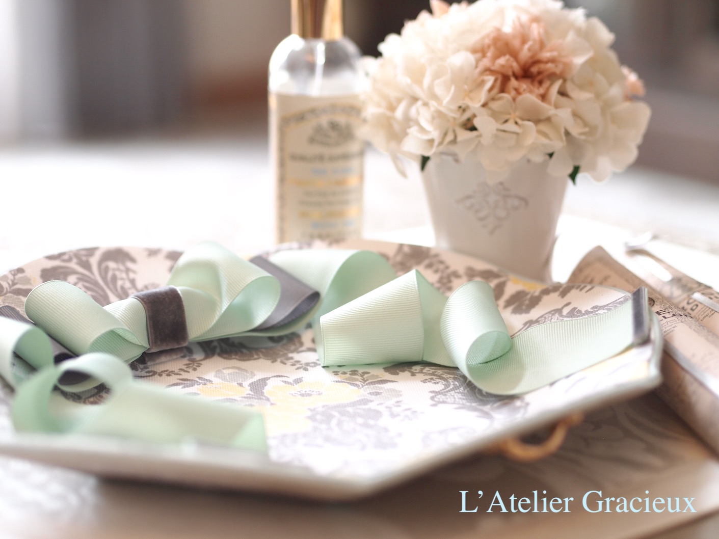 私の定番となっているミントグリーンとグレイのグログランリボンに、